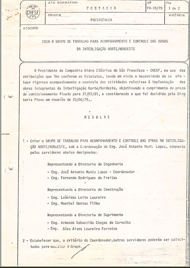 Conjunto documental contendo documentos que retratam a vida profissional na CHESF no primeiro período em que trabalhou na empresa. Contém guia de promoção, correspondência interna com indicação do nome dele para atuar como coordenador do grupo de estudo da interligação Norte-Nordeste.