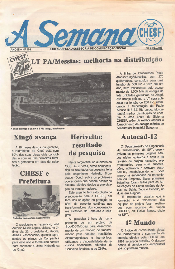 Folheto editado pela Assessoria de Comunicação Social da Companhia Hidro Elétrica - CHESF, com as principais informações que aconteceram na primeira semana de fevereiro de 1993, como a Linha de Transmissão Paulo Afonso (PA)-Messias, os avanços na obra da usina Xingó, e a visita do titular, Antonio Muniz ao prefeito de recife da época, Jarbas Vasconcelos.