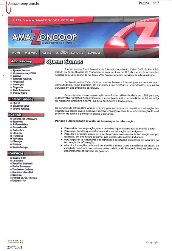 Documentos TextuaisAmazoncoop23/07/2003 DescritorAmazôniaAltamira - PAPovos Indígenas compartilhar contribua Informações geraisNúmero de RegistroJAM.S06.D02FundoJosé Antonio Muniz Lopes / Série Pesquisa de Interesse Profissional (12/12/1991 a 00/02/2008)ArranjoNúmero de documentos1Número de páginas8IdiomaPortuguêsIdiomaDescriçãoImpressão da página da internet do projeto Amazoncoop, que foi acumulado pelo titular.Estado de conservaçãoBomEstado de ConservaçãoDocumentos RelacionadosJAM.S06.D02.pdf1,72M
