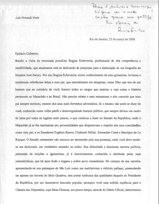Carta produzida por Luiz Fernando Freire, filho de José Sarney, direcionada para Epitácio Café, na qual Luiz questiona as falas de Café sobre seu pai.