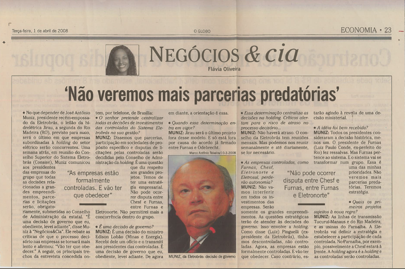 Conjunto documental contendo reportagens e artigos sobre José Antonio Muniz enquanto o mesmo atuou como presidente da Eletrobras.