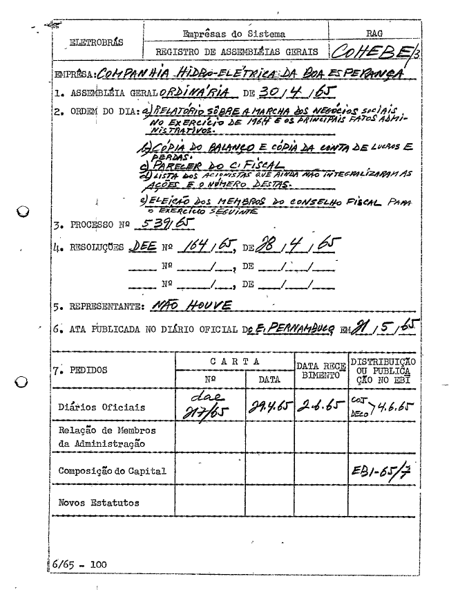 Documentos referentes à Assembleia Geral Ordinária da Companhia Hidro Elétrica Boa Esperança - COHEBE, realizada em 30 de abril de 1965, tendo como ordem do dia o relatório sobre a marcha dos negócios sociais no exercício de 1964 e os principais fatos administrativos, cópia do balanço e cópia da conta de lucros e perdas, parecer do Conselho Fiscal, e lista dos acionistas que não haviam integralizado as ações eleição dos membros do Conselho Fiscal para o exercício seguinte.