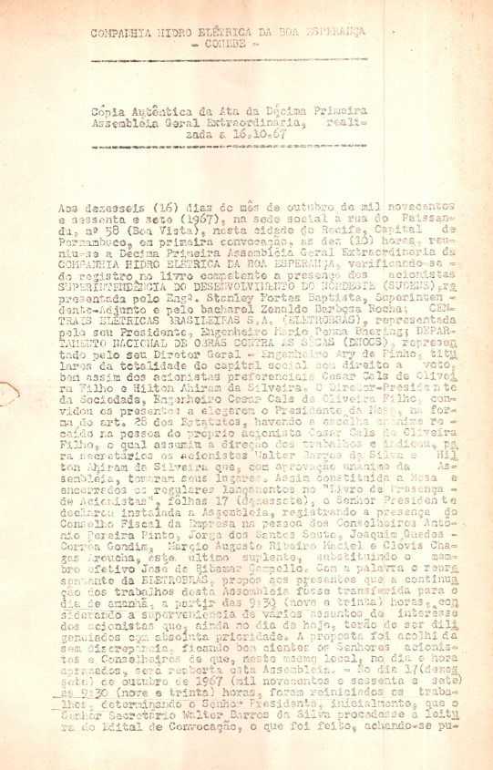 Documentos referentes à Assembleia Geral Extraordinária da Companhia Hidro Elétrica Boa Esperança - COHEBE, realizada em 16 de outubro de 1967, tendo como ordem do dia o aumento do capital social, reforma estatutária e outros assuntos de interesse da companhia.