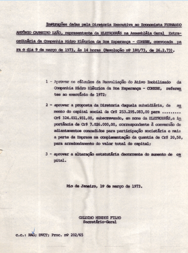 Documentos referentes à Assembleia Geral Extraordinária da Companhia Hidro Elétrica Boa Esperança - COHEBE, realizada em 09 de março de 1973, tendo como ordem do dia a reavaliação do ativo, aumento do capital social e modificação do estatuto, e outros assuntos de interesse da companhia.