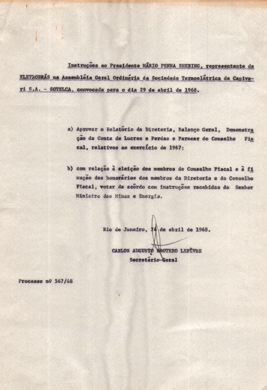 Documentos referentes à Assembleia Geral Ordinária da Sociedade Termoelétrica de Capivari - Sotelca, empresa associada a holding Eletrobras, realizada em 29 de abril de 1968, tendo como ordem do dia o relatório da Diretoria, eleição dos membros do Conselho Fiscal, fixação de honorários do Conselho Fiscal e Diretoria, e assuntos de interesse da companhia. Inclui pauta encaminhada a Mário Penna Bhering, representante da Eletrobras.
