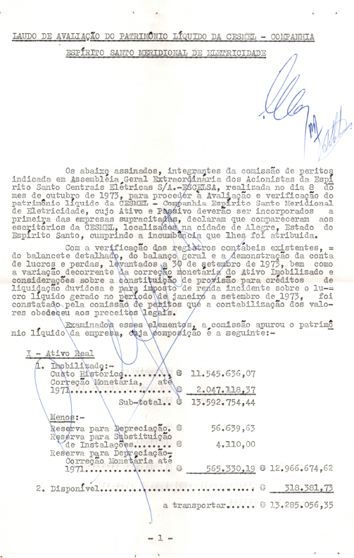 Laudo da avaliação do patrimônio da Companhia Espírito Santo Meridional de Energia - CESMEL, realizado por peritos indicados em assembleia da Espírito Santo Centrais Elétricas S.A. - ESCELSA, que tinha como propósito avaliar o patrimônio líquido da CESMEL, pois a mesma seria incorporada a ESCELSA.