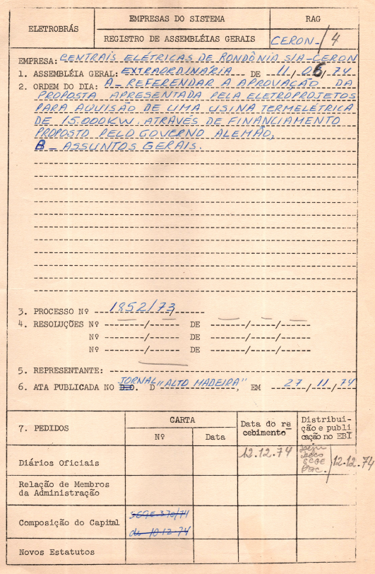 Documentos referentes à Assembleia Geral Extraordinária da Centrais Elétricas de Rondônia S.A. - CERON, realizada em 11 de junho de 1974, tendo como ordem do dia referendar a proposta da Eletroprojetos para a aquisição de uma usina termelétrica de 15.000 kW e assuntos de interesse da empresa.