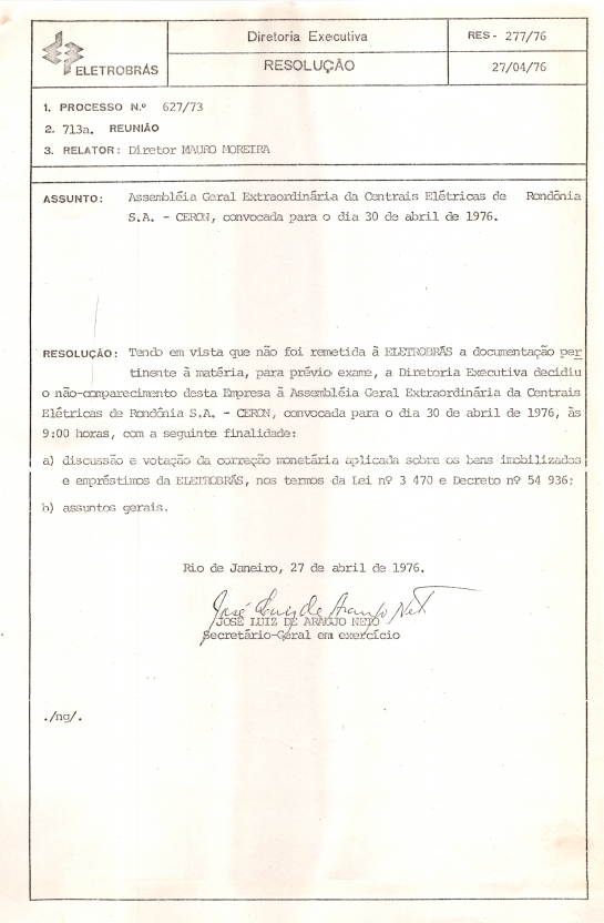 Documentos referentes à Assembleia Geral Extraordinária da Centrais Elétricas de Rondônia S.A. - CERON, realizada em 30 de abril de 1976, tendo como ordem do dia a discussão e votação da correção monetária aplicada sobre os bens imobilizados e empréstimos da Eletrobras e ainda assuntos gerais de interesse da empresa.