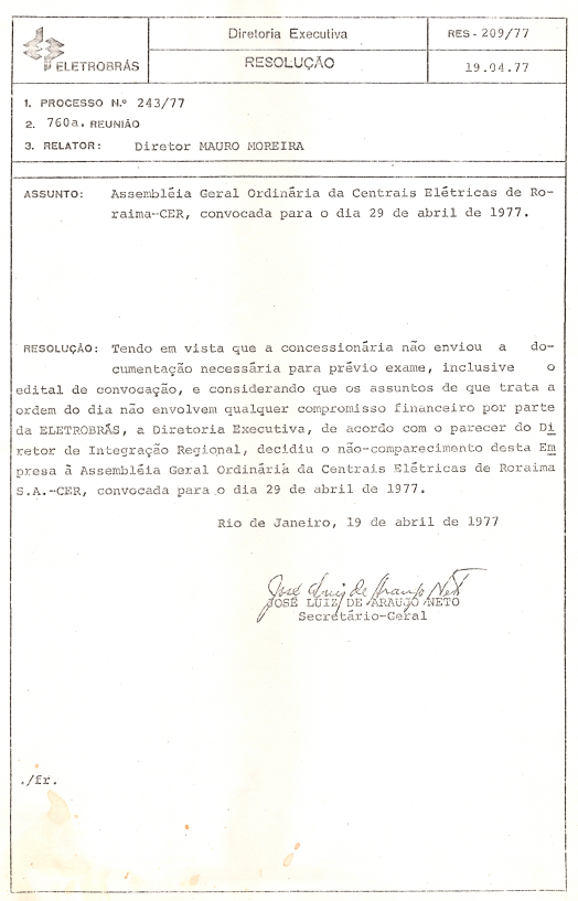 Documentos referentes à Assembleia Geral Ordinária da Centrais Elétricas de Roraima S.A. - CER , realizada em 29 de abril de 1977, tendo como ordem do dia a aprovação do relatório da Diretoria, apreciação do balanço, demonstração de contas do exercício de 1976, eleição do conselho fiscal, fixação da remuneração dos diretores e do Conselho Fiscal e assuntos de interesse da companhia.