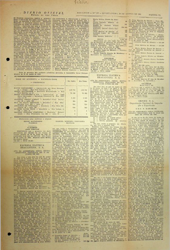 Documentos referentes à Assembleia Geral Extraordinária da Empresa Elétrica de Bragantina - EEB, realizada em 12 de junho de 1969, tendo como ordem do dia o aumento do capital social, reforma do estatuto e outros assuntos de interesse da empresa.
