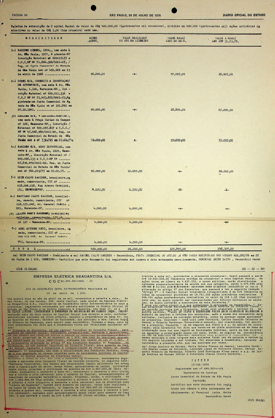 Documentos referentes à Assembleia Geral Extraordinária da Empresa Elétrica de Bragantina - EEB, realizada em 04 de abril de 1976, tendo como ordem do dia o aumento do capital social, alteração do estatuto, e outros assuntos de interesse da empresa.