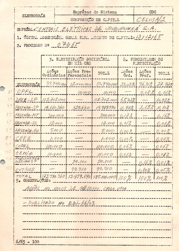 Ficha contendo dados gerais sobre a Centrais Elétricas de Urubupungá S.A. - CELUSA, com dados referentes à porcentagem de participação das empresas que eram acionistas da CELUSA, bem como nomes de membros da Diretoria e do Conselho Fiscal em 13 de dezembro de 1965.