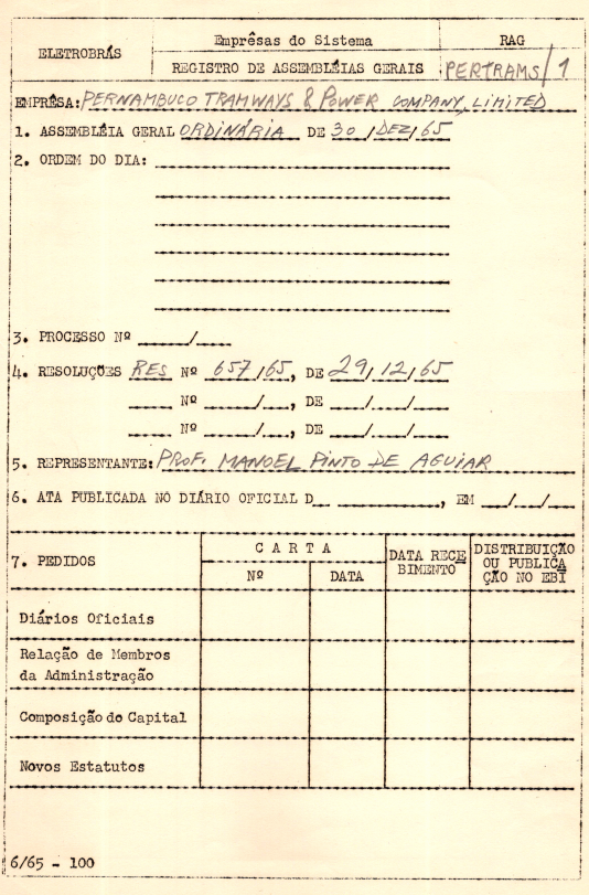 Documento referente ao registro da Assembleia Geral Ordinária da Pernambuco Tramways & Power Company Limited, que ocorreu em 30 de dezembro de 1965.