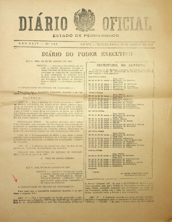 Edição do Diário Oficial do Estado de Pernambuco, ano 44, número 160, no qual foi publicado a lei que sentenciou a transferência das ações da Pernambuco Tramways & Power Company Limited do Estado de Pernambuco para a Eletrobras.
