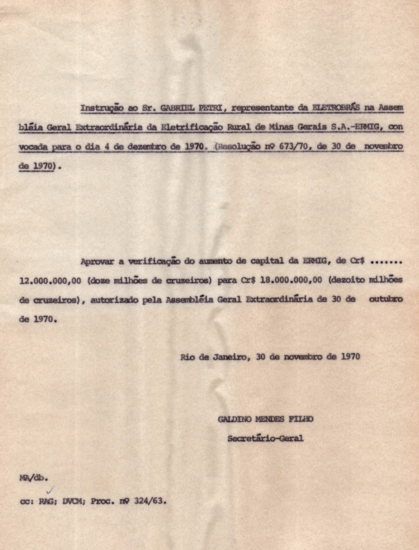 Documentos referentes à Assembleia Geral Extraordinária da Eletrificação Rural de Minas Gerais S.A. - ERMIG, realizada em 04 de dezembro de 1970, tendo como ordem do dia a verificação do aumento do capital social e outros assuntos de interesse da companhia. Inclui pauta de reunião, enviada a Gabriel Petri, representante da Eletrobras.