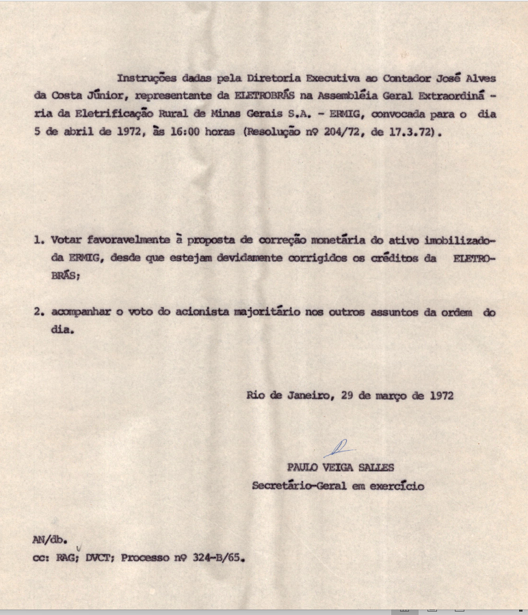 Documentos referentes à Assembleia Geral Extraordinária da Eletrificação Rural de Minas Gerais S.A. - ERMIG, realizada em 05 de abril de 1972, tendo como ordem do dia a proposta da diretoria para a correção monetária do ativo imobilizado e outros assuntos de interesse da companhia. Inclui pauta de reunião, enviada a José Alves da Costa Júnior, representante da Eletrobras.