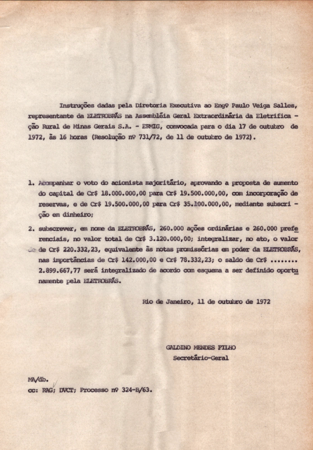 Documentos referentes à Assembleia Geral Extraordinária da Eletrificação Rural de Minas Gerais S.A. - ERMIG, realizada em 17 de outubro de 1972, tendo como ordem do dia o aumento do capital social e outros assuntos de interesse da companhia. Possui pauta de reunião, enviada a Paulo Veiga Salles, representante da Eletrobras.
