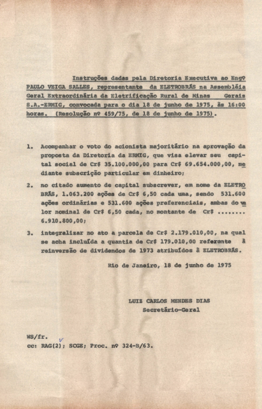 Documentos referentes à Assembleia Geral Ordinária da Eletrificação Rural de Minas Gerais S.A. - ERMIG, realizada em 18 de junho de 1974, tendo como ordem do dia o aumento do capital social e outros assuntos de interesse da companhia. Inclui pauta da reunião, enviada a Paulo Veiga Salles, representante da Eletrobras.