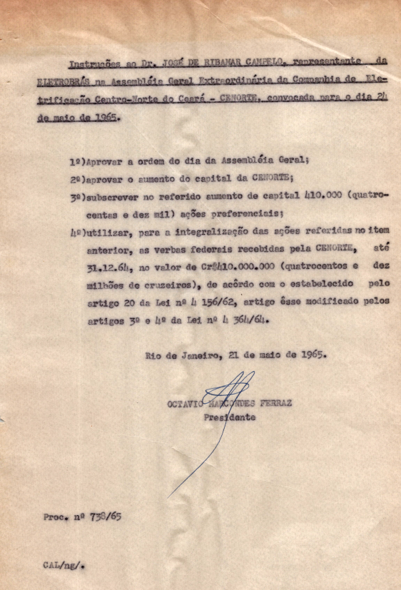 Documentos referentes à Assembleia Geral Ordinária da Companhia de Eletrificação Centro-Norte do Ceará S.A. - CENORTE, realizada em 24 de maio de 1965, tendo como ordem do dia o aumento do capital social, reforma parcial dos estatutos sociais e outros assuntos de interesse da companhia. Possui pauta da reunião, enviada a José de Ribamar Campelo, representante da Eletrobras.