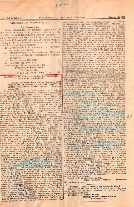 Documentos referentes à Assembleia Geral Extraordinária da Companhia de Eletrificação Centro-Norte do Ceará S.A. - CENORTE, realizada em 29 de dezembro de 1967, tendo como ordem do dia a aprovação do aumento do capital social, ultimação das demais providências relacionadas com o aumento, reforma parcial dos estatutos sociais e outros assuntos de interesse da companhia.
