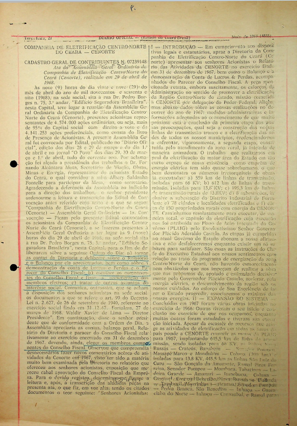 Documentos referentes à Assembleia Geral Ordinária da Companhia de Eletrificação Centro-Norte do Ceará S.A. - CENORTE, realizada em 29 de abril de 1968, tendo como ordem do dia a tomada de conta da Diretoria, deliberar sobre o relatório e o balanço da conta de lucros e perdas, parecer do Conselho Fiscal, eleição do Conselho Fiscal, fixação dos honorários e outros assuntos de interesse da companhia.