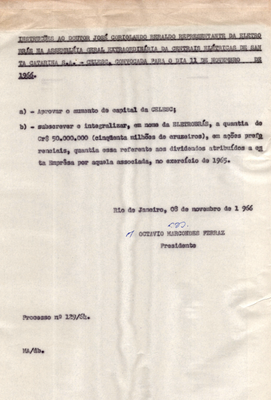 Documentos referentes à Assembleia Geral Extraordinária das Centrais Elétricas de Santa Catarina S.A. - CELESC, empresa associada da Eletrobras, realizada em 11 de novembro de 1966, tendo como ordem do dia o aumento do capital, e outros assuntos de interesse da companhia. Inclui pauta da reunião encaminhada a José Coriolando Beraldo, representante da Eletrobras.