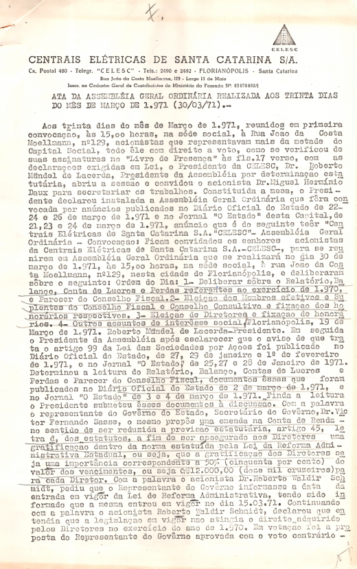 Registro de Assembleia Geral Ordinária da CELESC de março de 1971
