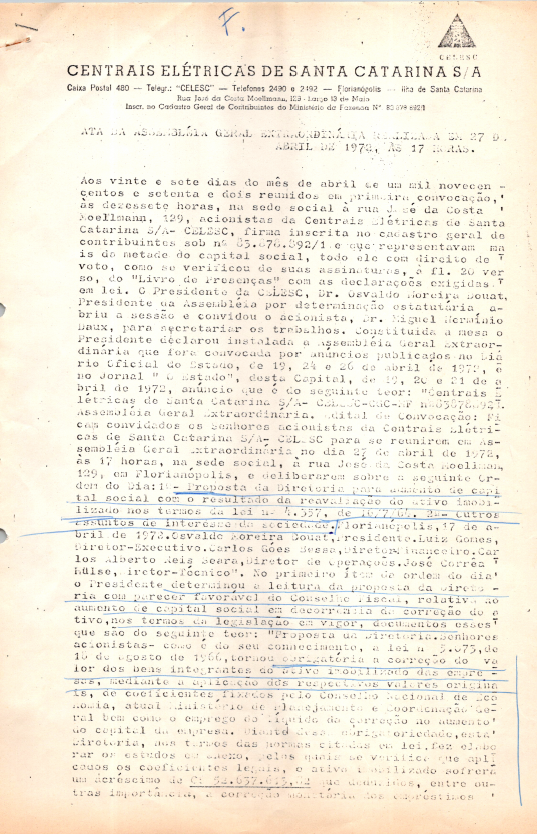 Registro de Assembleia Geral Extraordinária da CELESC de abril de 1972