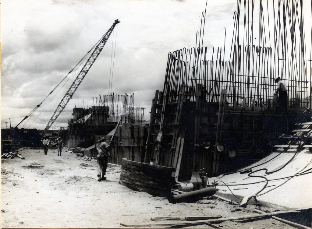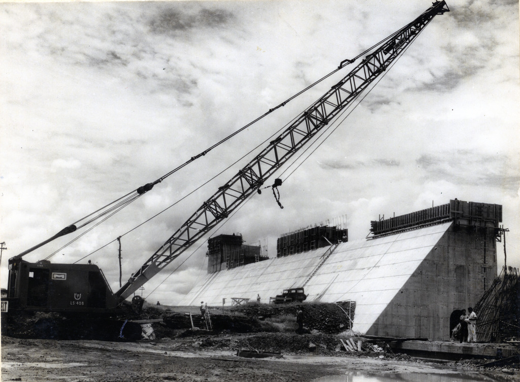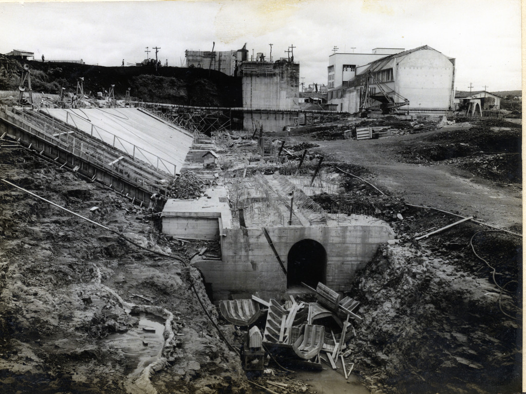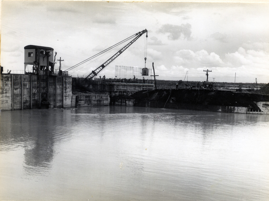 Conjunto fotográfico da construção da Usina Hidrelétrica Cachoeira Dourada, apresentando imagens das obras do vertedouro, barragem, tomada d'água, canal de fuga, vila operária e vistas aéreas do conjunto.