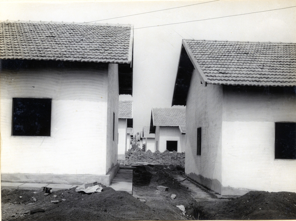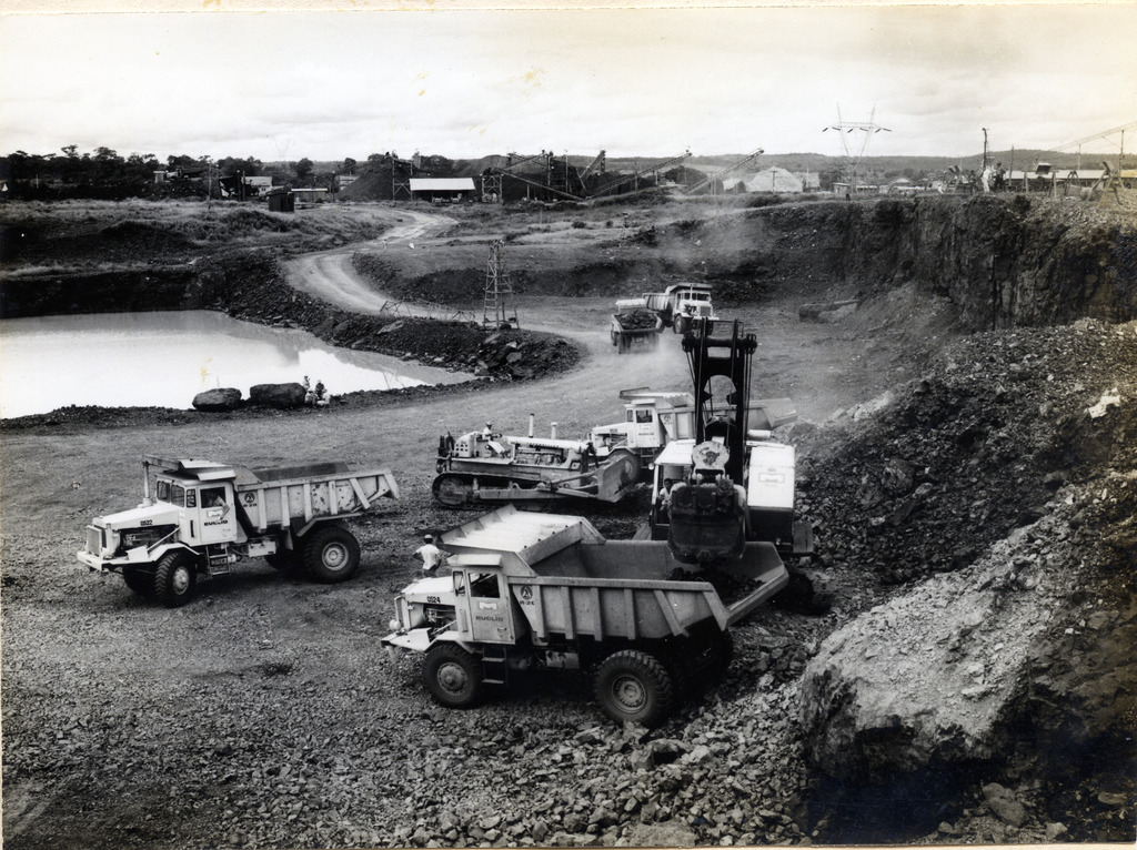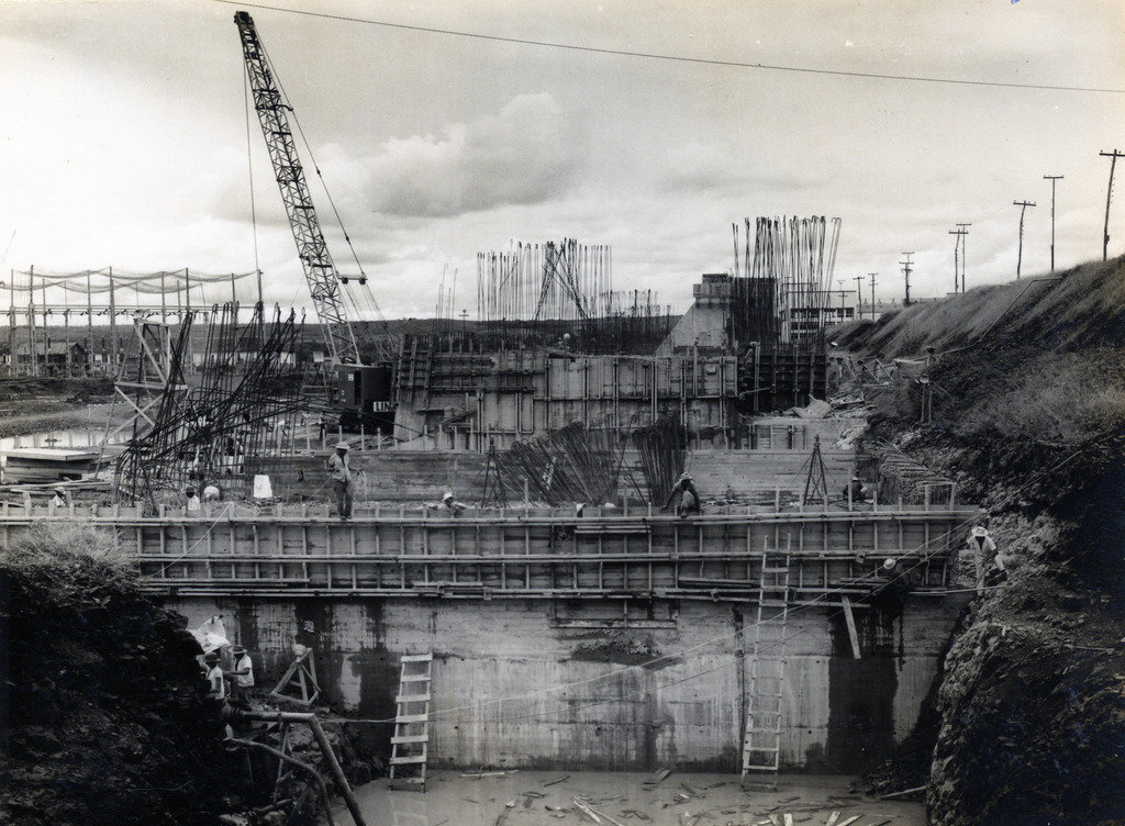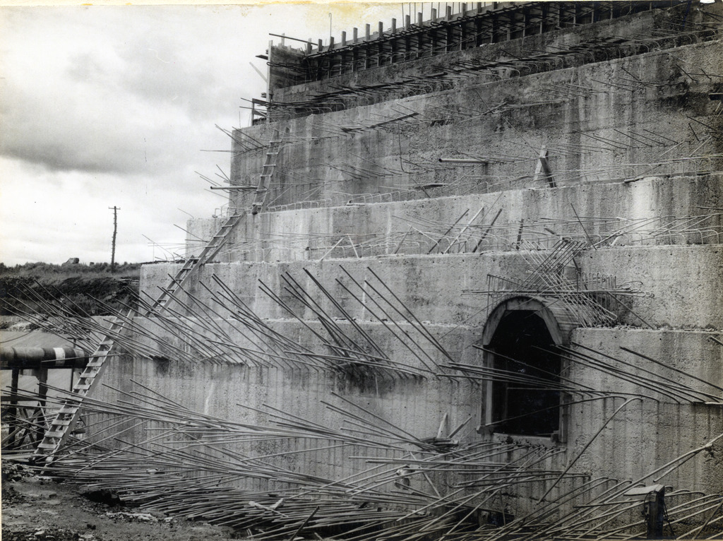 Conjunto fotográfico da construção da Usina Hidrelétrica Cachoeira Dourada, apresentando imagens das obras do vertedouro, barragem, tomada d'água, canal de fuga, vila operária e vistas aéreas do conjunto.
