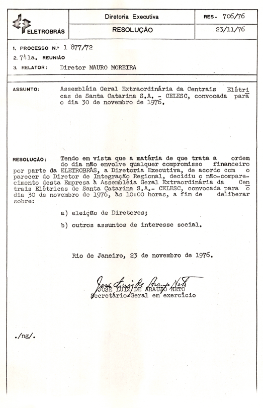 Registro de Assembleia Geral Extraordinária da CELESC de novembro de 1976
