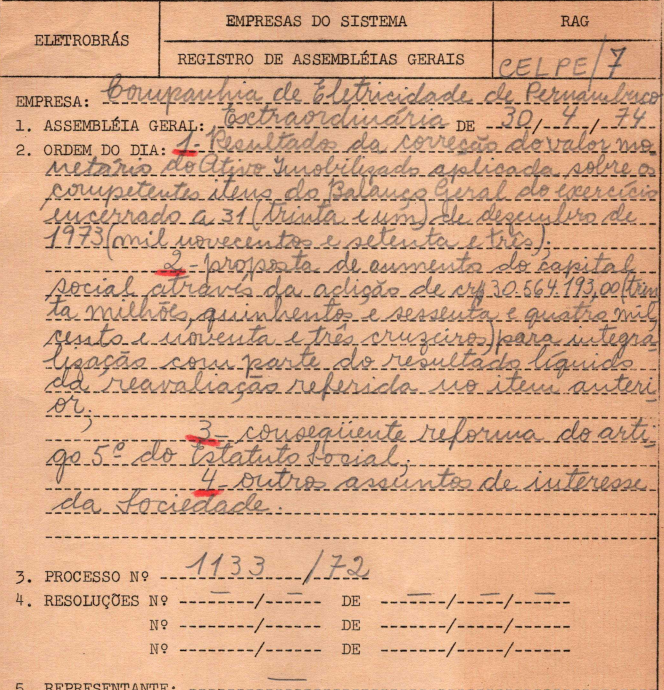 Documentos referentes à Assembleia Geral Extraordinária da Companhia de Eletricidade de Pernambuco - CELPE, empresa associada da Eletrobras, realizada em 30 de abril de 1974, tendo como ordem do dia apresentação dos resultados da correção do valor no relatório do ativo imobilizado, proposta de aumento do capital social, reforma estatutária e outros assuntos de interesse da companhia.