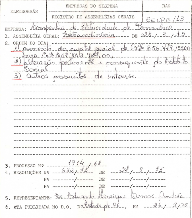 Documentos referentes à Assembleia Geral Extraordinária da Companhia de Eletricidade de Pernambuco - CELPE, empresa associada da Eletrobras, realizada em 28 de agosto de 1975, tendo como ordem do dia o aumento do Capital Social, alteração do Estatuto Social e outros assuntos de interesse da companhia. Inclui pauta encaminhada a Eduardo Henrique Lemos Andréa, representante da Eletrobras, Ata da referida Assembleia e publicação da Ata no Diário Oficial de Pernambuco.