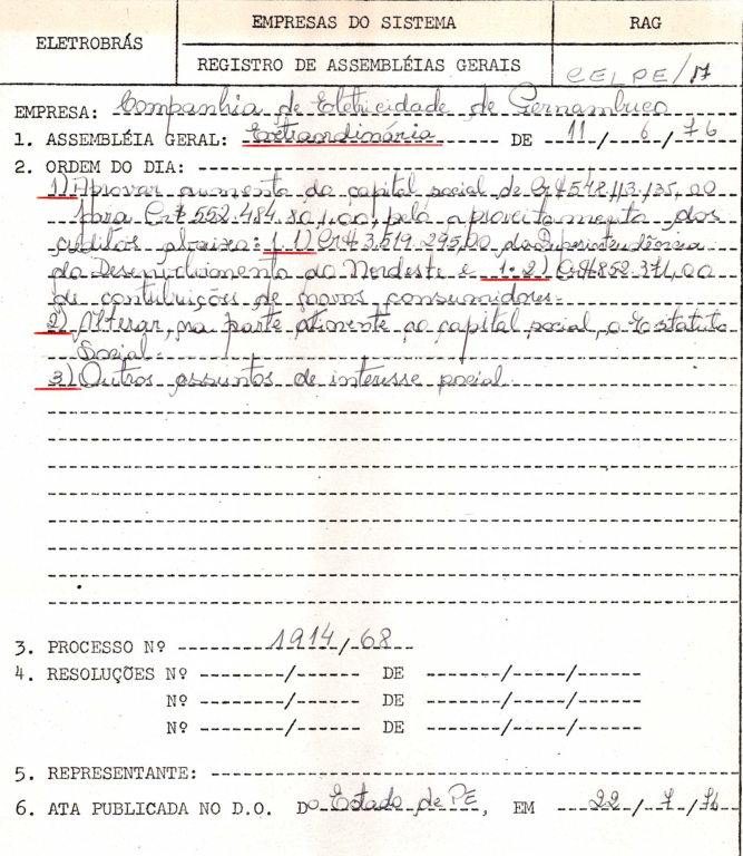 Registro da Assembleia Geral Extraordinária da CELPE de junho de 1976