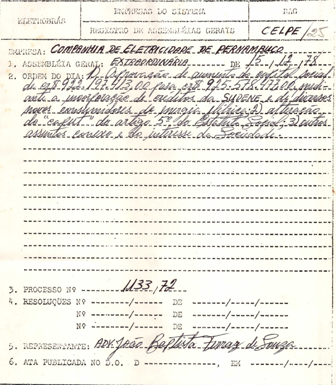 Registro da Assembleia Geral Extraordinária da CELPE de dezembro de 1978