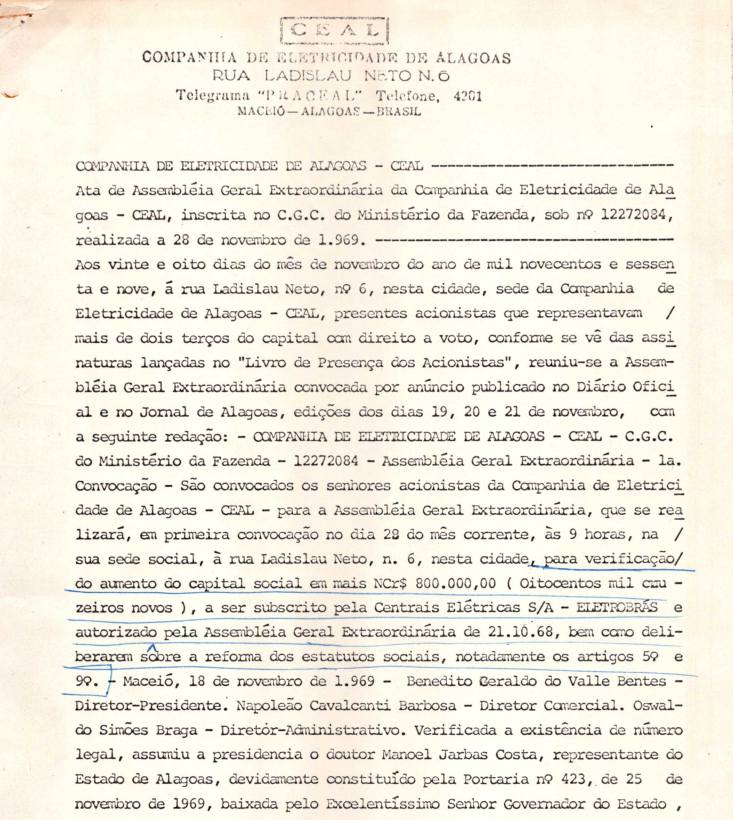 Documentos referentes à Assembleia Geral Extraordinária da Companhia de Eletricidade de Alagoas - CEAL, realizada em 28 de novembro de 1969, tendo como ordem do dia a verificação do aumento do capital social.