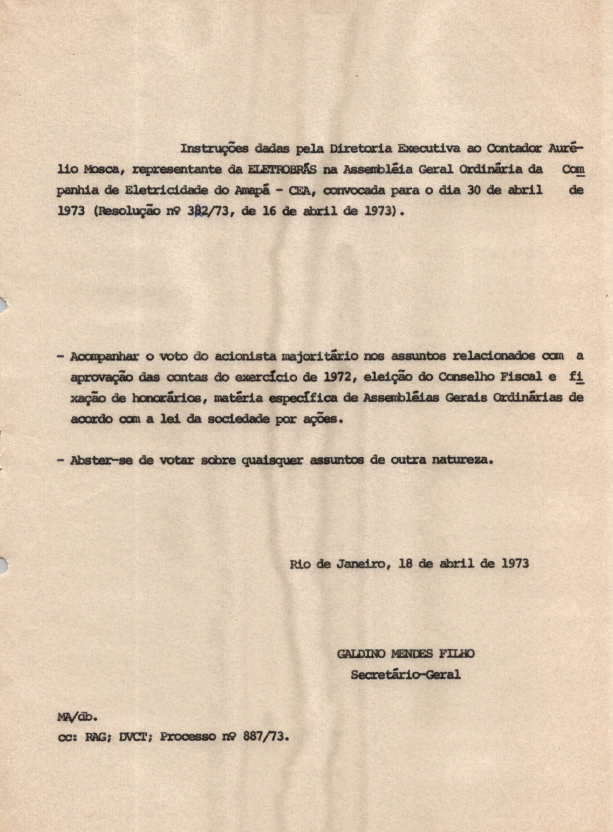 Documentos referentes à Assembleia Geral Ordinária da Companhia de Eletricidade do Amapá - CEA, realizada em 30 de abril de 1973, tendo como ordem do dia o balanço geral, contas de lucros e perdas, relatório da diretoria do exercício de 1972, eleição de membros da diretoria e do conselho discal, fixação dos honorários e outros assuntos de interesse da companhia. Possui pauta da reunião, enviada a Aurélio Mosca, representante da Eletrobras.