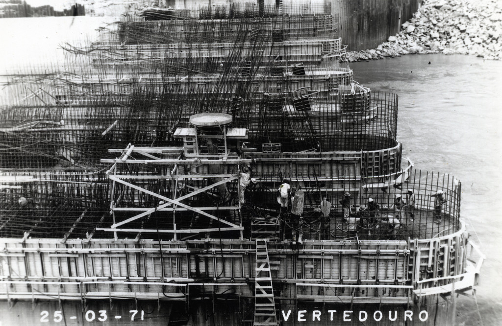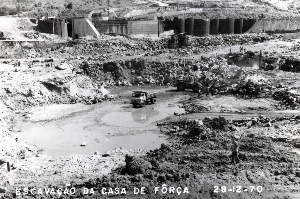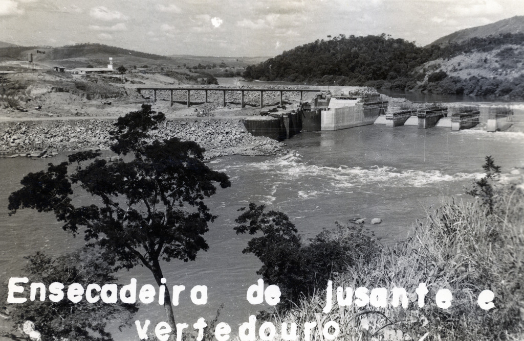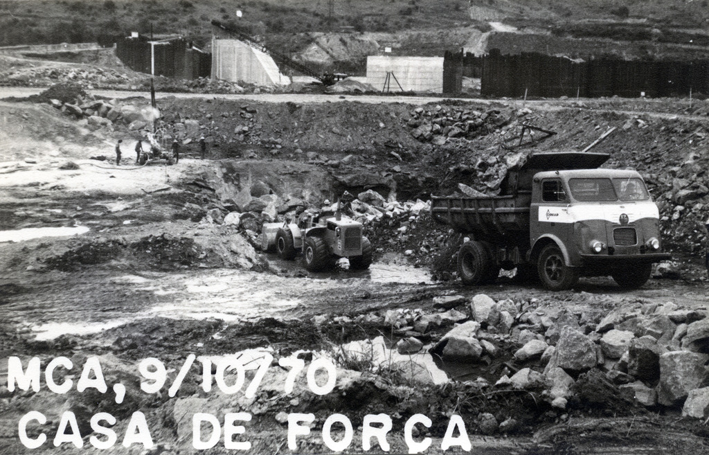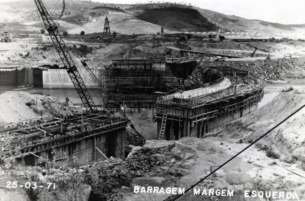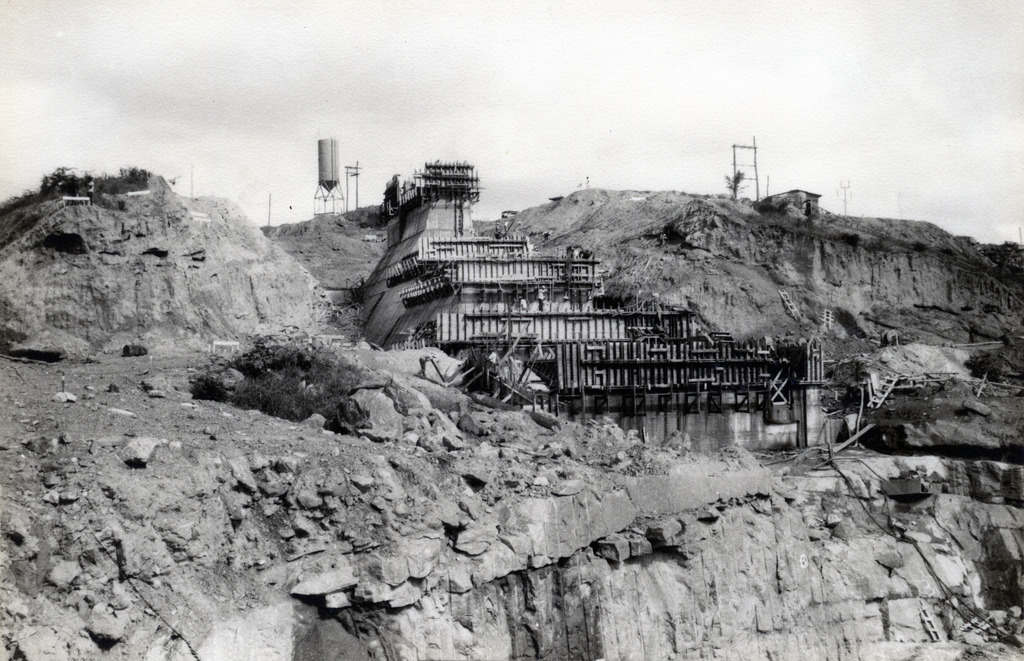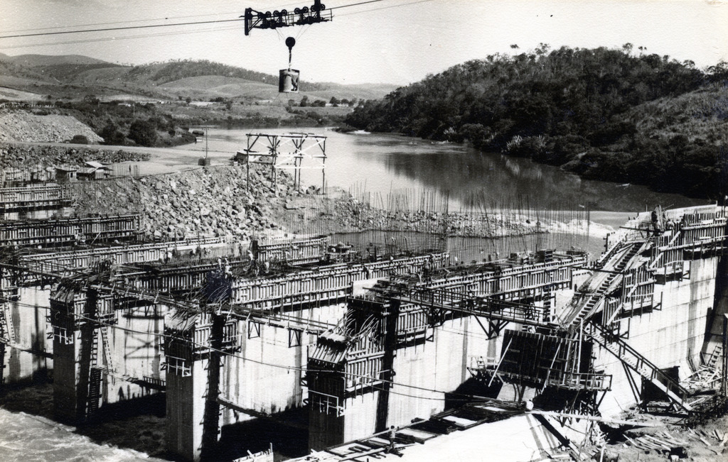 Fotografias referentes a construção da Usina Hidrelétrica Mascarenhas, com imagens das obras no vertedouro, barragem, ensecadeira e casa de força.