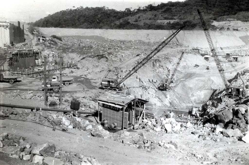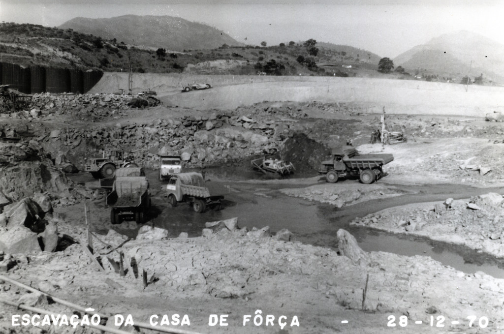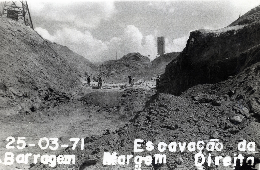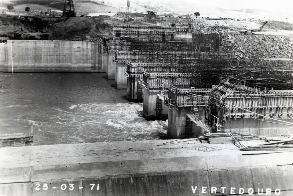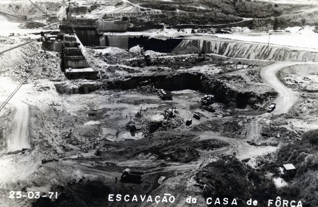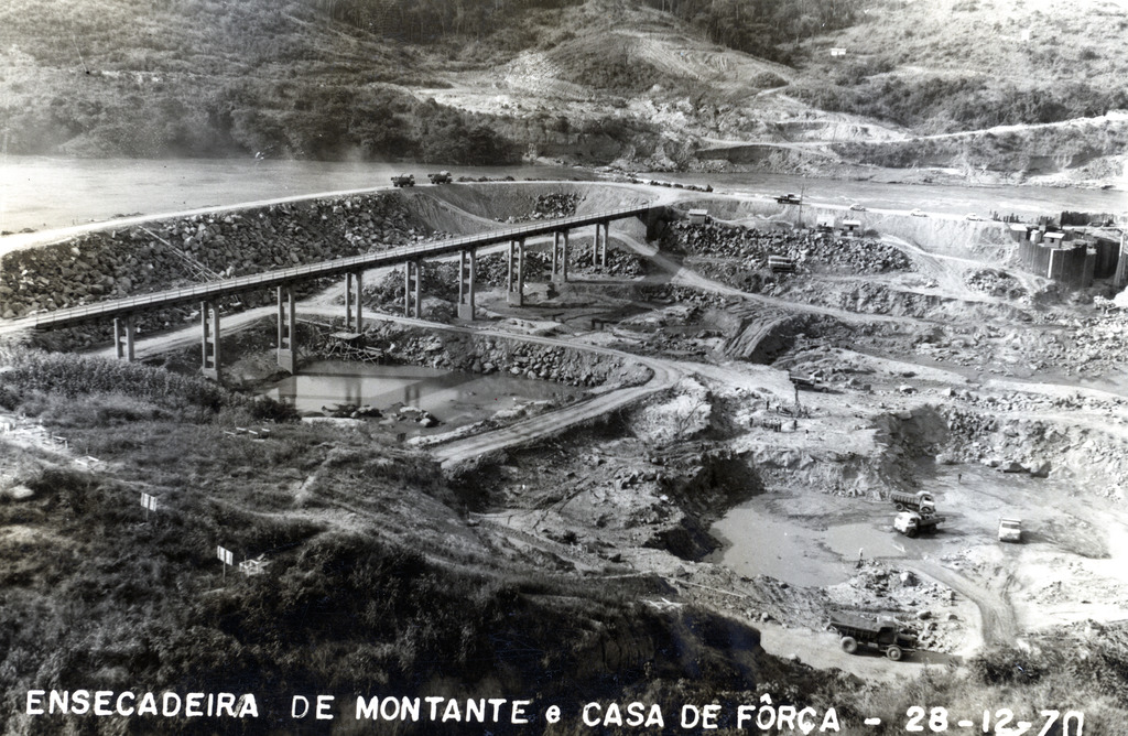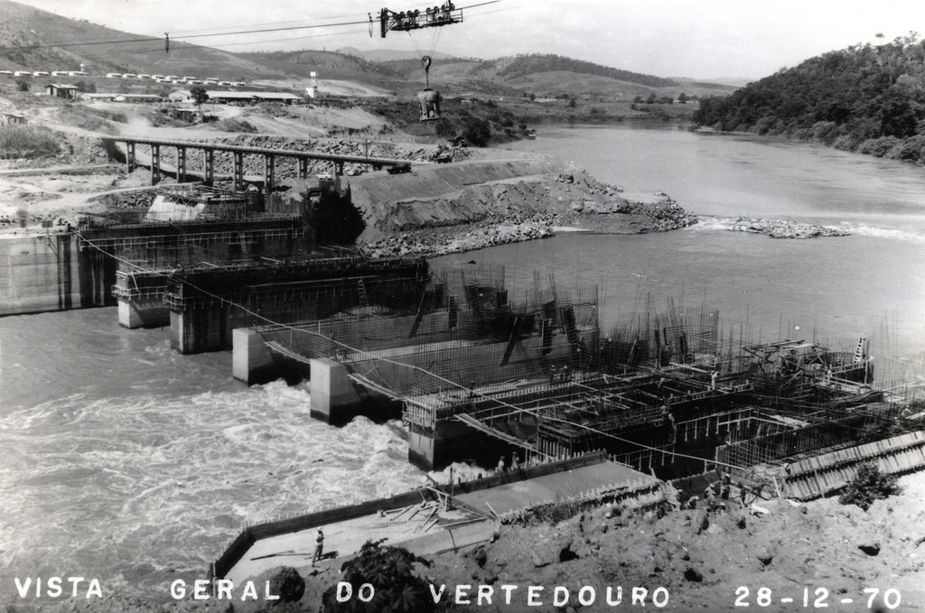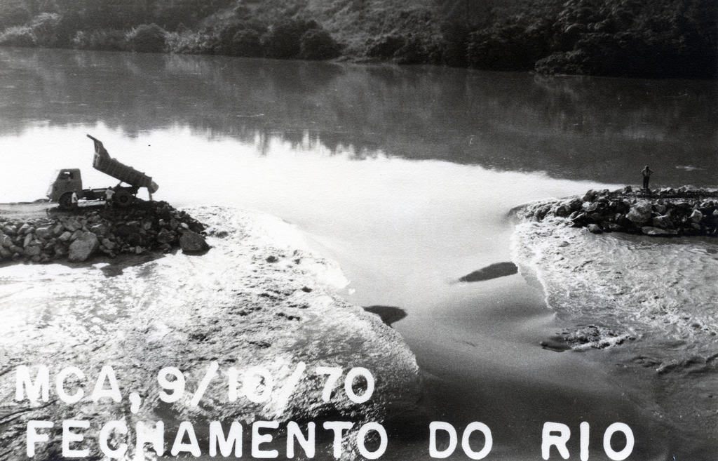 Fotografias referentes a construção da Usina Hidrelétrica Mascarenhas, com imagens das obras no vertedouro, barragem, ensecadeira e casa de força.