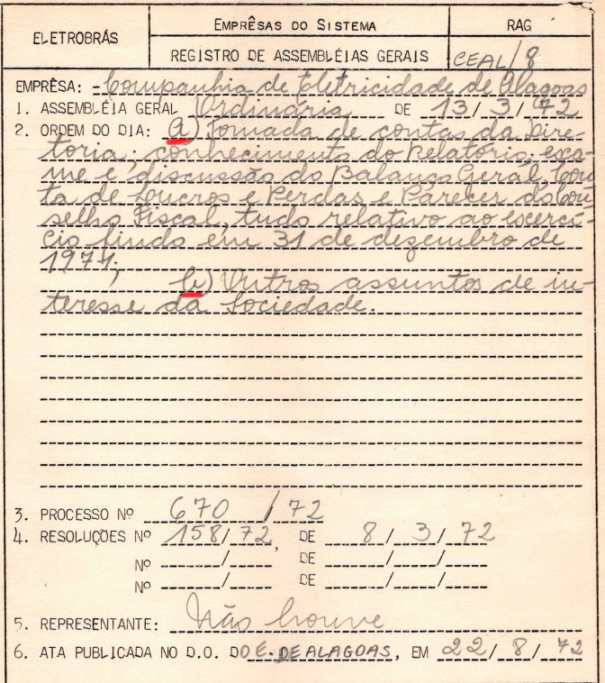 Documentos referentes à Assembleia Geral Ordinária da Companhia de Eletricidade de Alagoas - CEAL, realizada em 13 de março de 1972, tendo como ordem do dia a tomada de contas da Diretoria, parecer do Conselho Fiscal e outros assuntos de interesse da empresa.