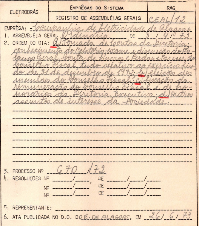 Documentos referentes à Assembleia Geral Ordinária da Companhia de Eletricidade de Alagoas - CEAL, realizada em 3 de abril de 1973, tendo como ordem do dia tomada de contas da Diretoria, parecer do Conselho Fiscal, assuntos relativos ao exercício findo em 31 de outubro de 1972, eleição dos membros do Conselho Fiscal e outros assuntos de interesse da empresa. Contém cópia da ata da referida Assembleia publicada em Diário Oficial de Maceió.