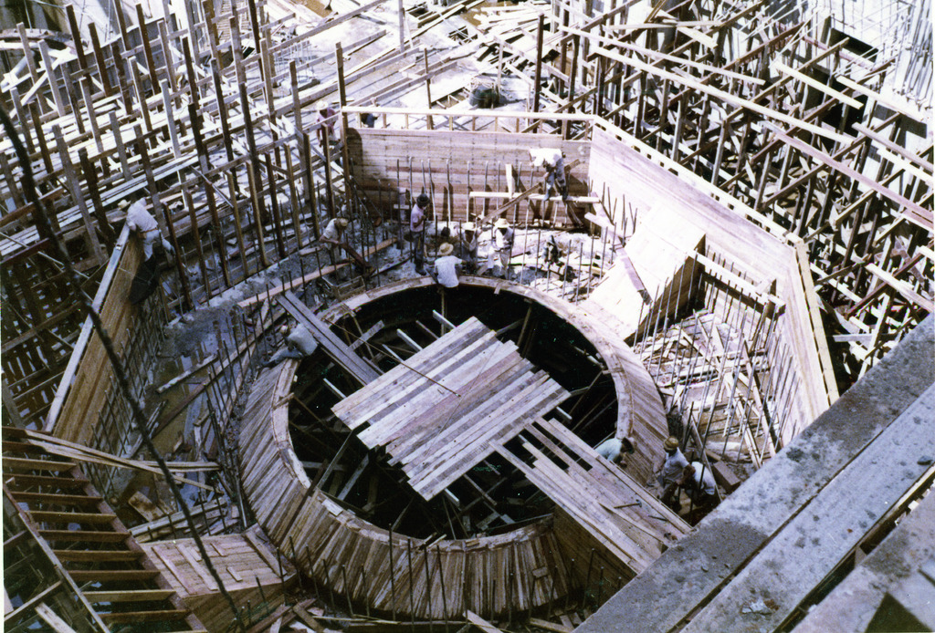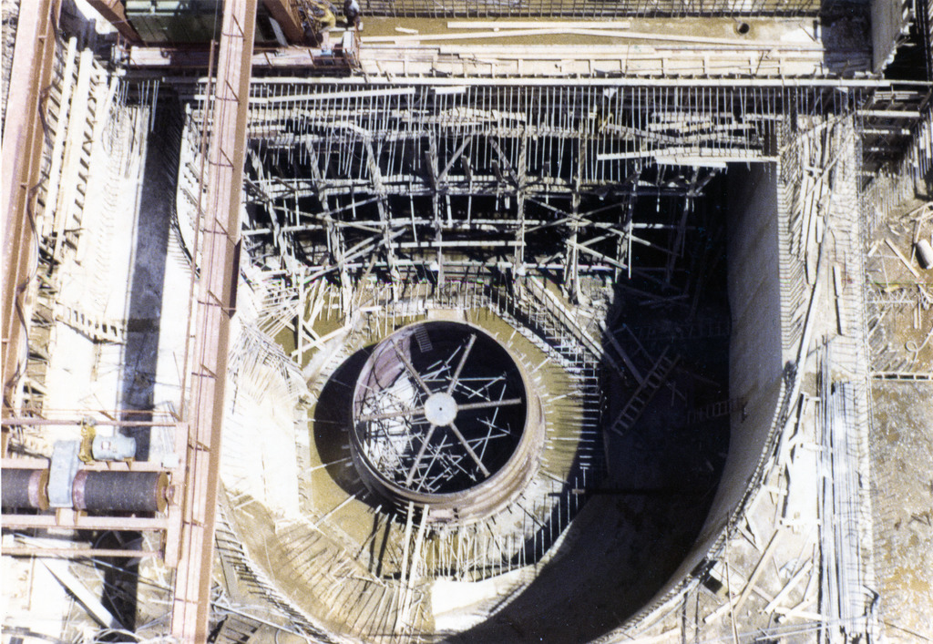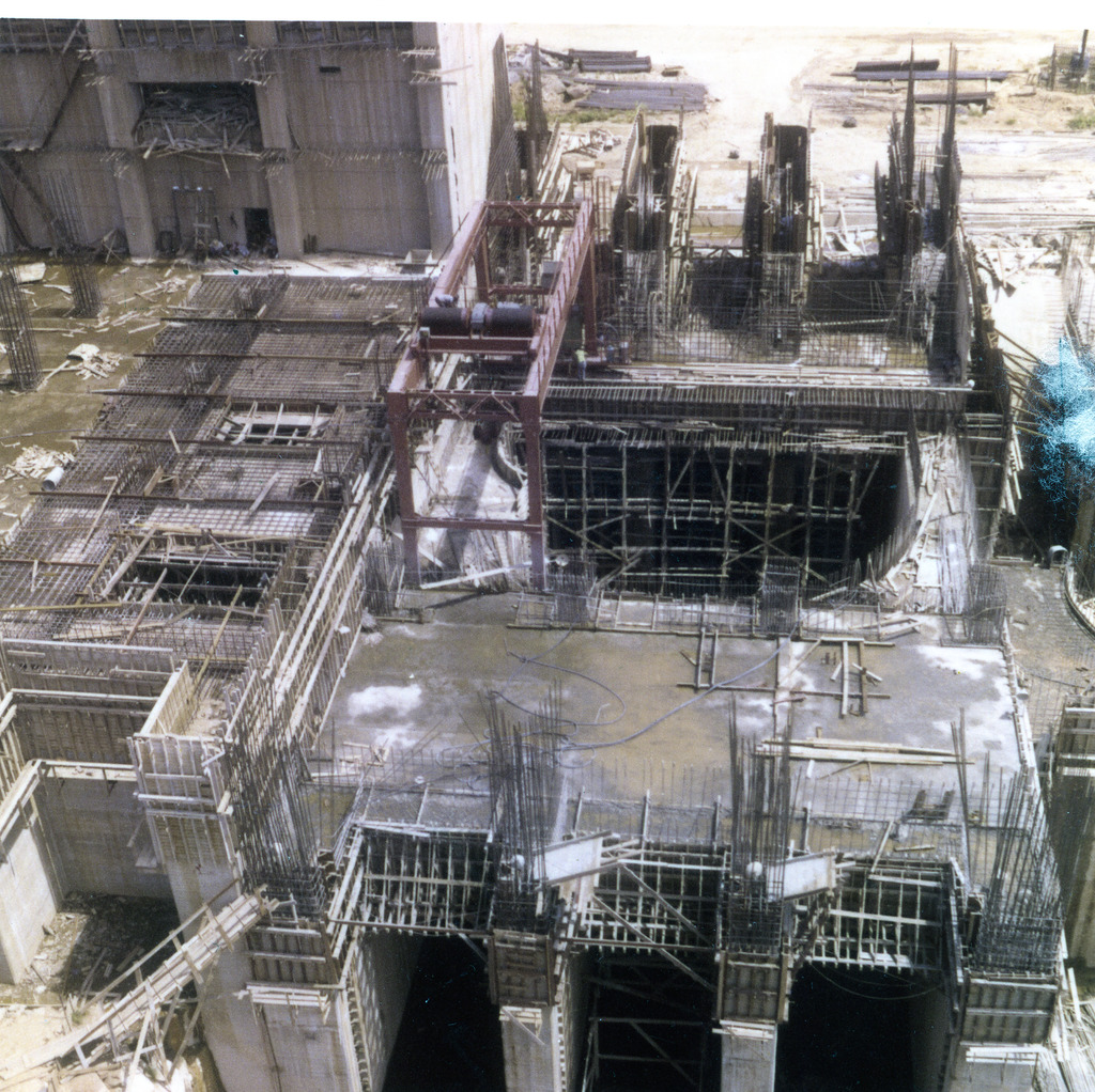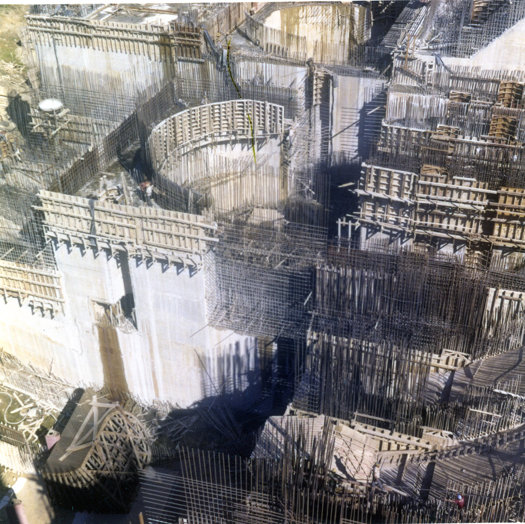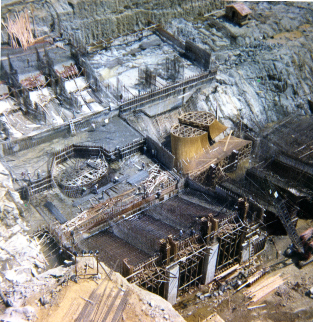 Conjunto fotográfico da construção da Usina Hidrelétrica Mascarenhas de Moraes, com imagens das obras na casa de força, vertedouro, barragem central, canal de fuga e subestação.
