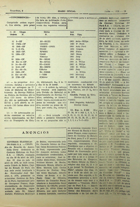 Documentos referentes à Assembleia Geral Extraordinária das Centrais Elétricas do Pará S.A. - CELPA, realizada em 29 de abril de 1970, tendo como ordem do dia a deliberação do balanço e relatório da diretoria, relativo ao exercício de 1969 e respectivo parecer do conselho fiscal, eleger os membros do conselho fiscal e seus suplentes para o próximo exercício, fixar os honorários da diretoria e do conselho fiscal e outros assuntos de interesse da companhia.