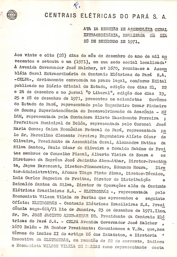 Registro de Assembleia Geral Extraordinária da CELPA de dezembro de 1971