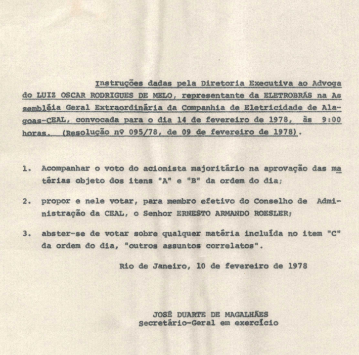 Documentos referentes à Assembleia Geral Extraordinária da Companhia de Eletricidade de Alagoas - CEAL, realizada em 14 de fevereiro 1978, tendo como ordem do dia reformulação estatutária, eleição dos membros para o Conselho de Administração e outros assuntos correlatos.