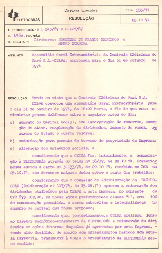 Documentos referentes à Assembleia Geral Extraordinária das Centrais Elétricas do Pará S.A. - CELPA, realizada em 31 de outubro de 1974, tendo como ordem do dia o aumento da capital social e a alteração dos estatutos sociais. Possui pauta da reunião, enviada a Norberto de Franco Medeiros e Mauro Moreira, representantes da Eletrobras.