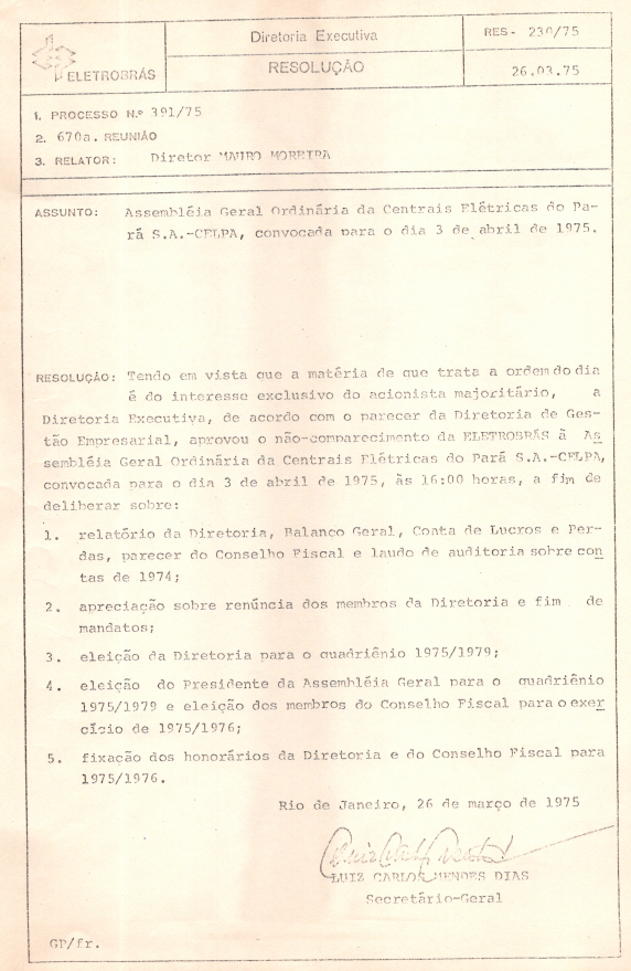 Documentos referentes à Assembleia Geral Ordinária das Centrais Elétricas do Pará S.A. - CELPA, realizada em 03 de abril de 1975, tendo como ordem do dia a deliberação do balanço e relatório da diretoria, relativo ao exercício de 1974 e respectivo parecer do conselho fiscal, renúncia de membros da diretoria e fim de mandatos, eleição de cargos da diretoria para o quadriênio 1975/1979, eleger os membros do conselho fiscal e seus suplentes para o próximo exercício e fixar os honorários da diretoria e do conselho fiscal.