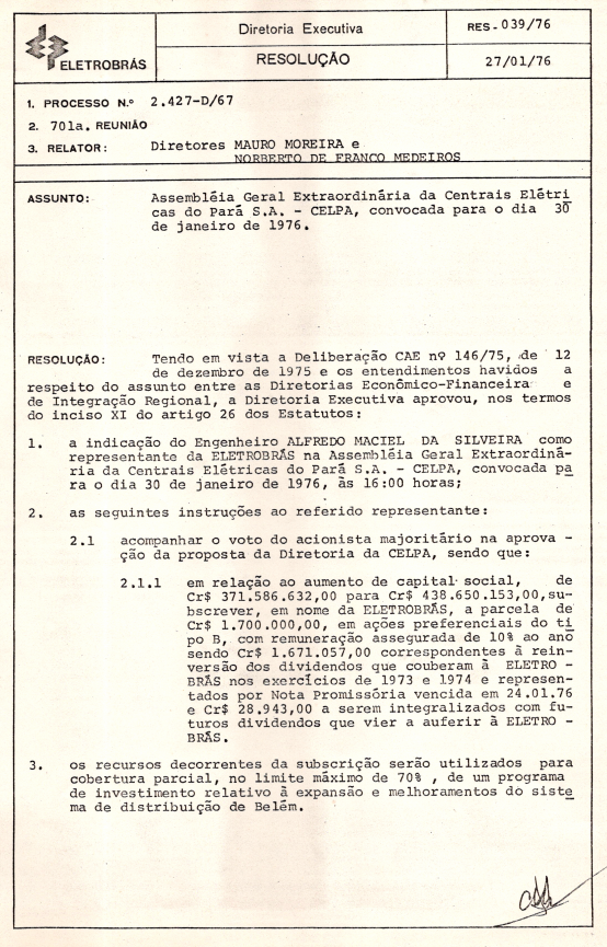 Registro de Assembleia Geral Extraordinária da CELPA de janeiro de 1976