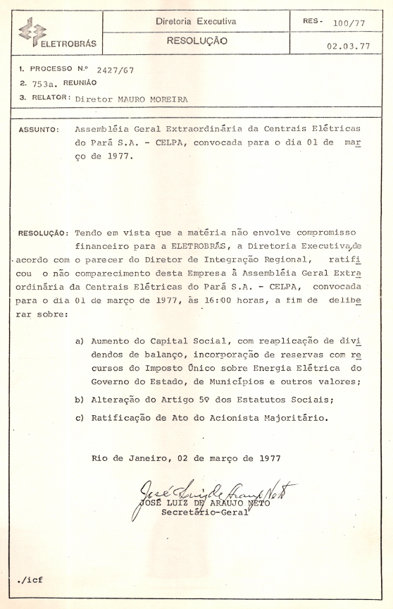 Registro de Assembleia Geral Extraordinária da CELPA de março de 1977
