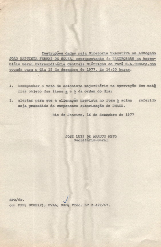 Documentos referentes à Assembleia Geral Extraordinária das Centrais Elétricas do Pará S.A. - CELPA, realizada em 19 de dezembro de 1977, tendo como ordem do dia a alteração das alíneas "c" e "d" do artigo 35 do Estatuto Social para assegurar dividendo mínimo obrigatório, e a autorização para alienação por venda de terreno pertencente ao patrimônio da empresa. Possui pauta da reunião, enviada a João Baptista Ferraz de Souza, representante da Eletrobras.
